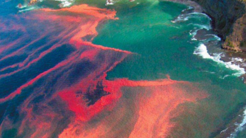 Kysten ligner Det Røde Hav, men det er faktisk giftige røde alger, som forgifter muslingefarmene, og tvinger dem til at lukke ned.