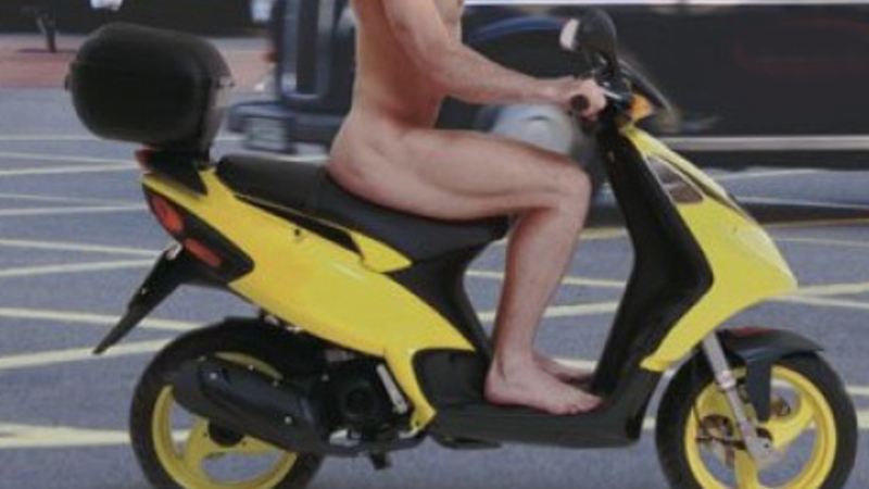 Chokerede vidner måtte tidligt søndag morgen lave et noget spøjst opkald til politiet. En nøgen ung mand kørte usikkert på en scooter på ...