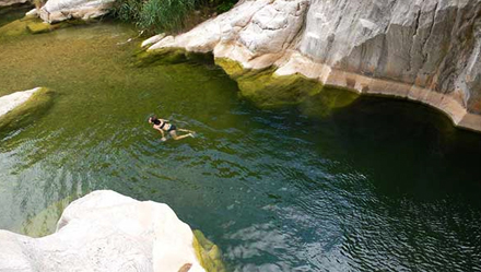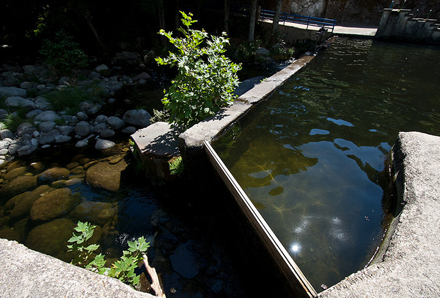 Der er ét for børn og et andet, der er dybere, for voksne, og her ”samlever” de badende med flodens naturlige beboere: ørreder. Vandet er stjerneklart og det er let at få øje på fiskene, der svømmer omkring i flodkanalen.