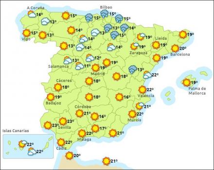 Catanbrien og de nordøstlige egne får fra og med i dag en del nedbør, og fra torsdag bliver det koldere. Mange steder skal man til at finde vanter og halstørklæde frem igen. I Valencia og Murcia er der udsigt til byger - muligvis med torden.