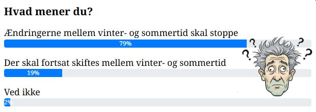 Tirsdag den 21. oktober foretog vi en meningsmåling blandt vores læsere, der viste, at 79 procent ønsker, at skiftet mellem normaltid og sommertid skal stoppe. Således burde samme procentdel læsere blive glade i morgen …!