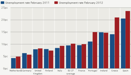 Ser vi et år tilbage i tiden, er arbejdsløsheden steget med svimlende 9,6 procentpoint til 23,6 procent. Siden marts 2011 har næsten 420.000 personer i Spanien mistet deres job. Gennemsnittet for eurolandene ligger på 10,8 procent, så Spanien halter ikke bare lidt men ekstremt langt bagefter.