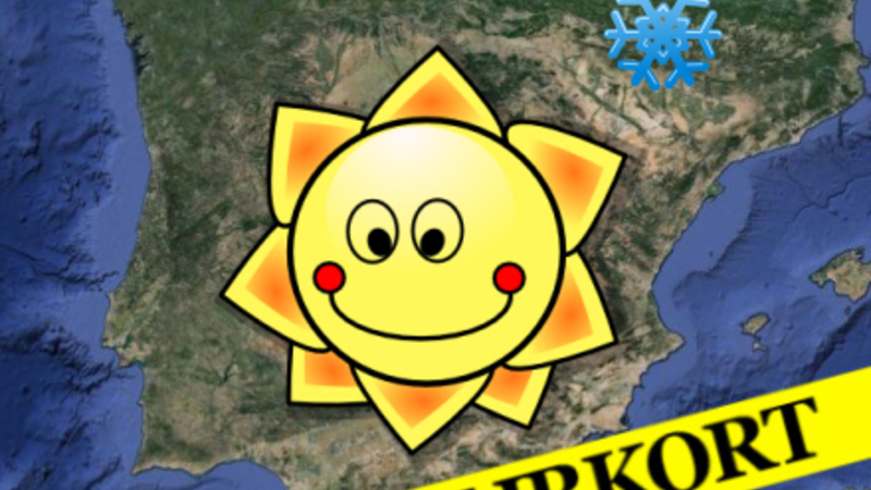 Madrid, skyet, ni – 20 grader, Barcelona efterhånden mere skyet 11 – 18, Valencia, tiltagende skydække, 12 – 22 og Málaga, sol 13 – 22 grader.