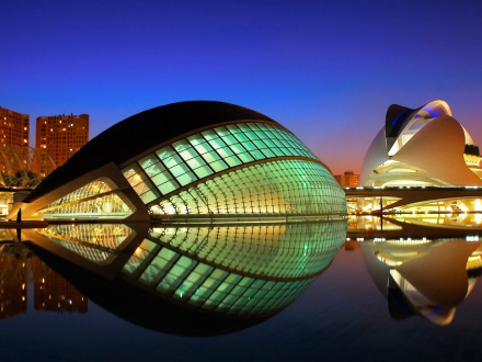 Palau de les Arts blev bygget i 2005 og er den næst nyeste af de i alt seks futuristisk-udseende bygninger, der udgør Valencias Kunst- og videnskabspark.