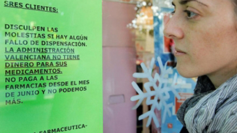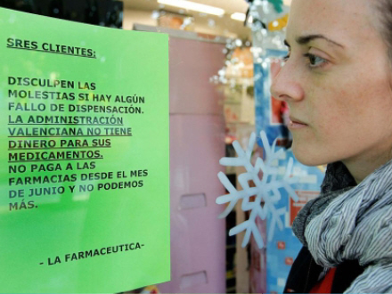 I Spanien er det skik, at apotekerne først indkøber medicin, for derefter at modtage betaling fra regionsmyndighederne. Men Valencia-regionen har ingen penge at tage af, og derfor er indbetalingerne udeblevet. Det drejer sig om månedsvis uden penge, og for flere apoteker skal man helt tilbage til februar for at finde indbetalinger fra myndighederne.