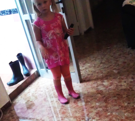 Administrationschef for DR Sydeuropa, Gunn Hansen, og hendes datter Mila fik også brug for gummistøvlerne i går. De kom nemlig hjem til oversvømmet patio, stue og køkken.