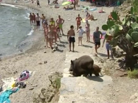 Hvis Bahamas er kendt for, at turister bader sammen med grise, så er vildsvin blevet en ny attraktion for badende på en strand i Girona i det ...