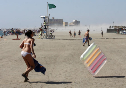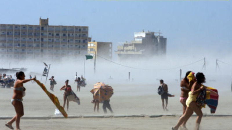Som lyn fra en klar himmel opstod der en række voldsomme vindstød, som fik liggestole og parasoller til at flyve vildt omkring. Vinden løftede sandet, så badende på stranden ikke kunne se en hånd frem for sig.