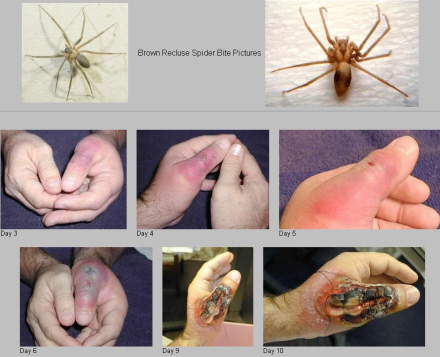 Selve biddet er ret smertefrit, og der ses bare en rød plet, men det er altså effekten af giften, der kan være alvorlig og alt andet end smertefri. Men i værre tilfælde kan det føre til store åbne sår, og nekrotiske sår.