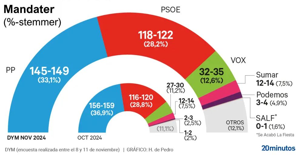 PP lider et hårdt slag efter Generalitat Valencianas kontroversielle håndtering af stormen, der ødelagde flere kommuner i Valencia-provinsen for et par uger siden, men det ville stadig være det største parti, hvis der var parlamentsvalg i morgen, og kunne regere i flertal sammen med Vox. DYM-Instituttet anslår, at Partido Popular ville få præcis det samme resultat som ved valget i juli 2023: 33,1 procent af stemmerne, næsten fem point foran PSOE.