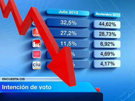 PP står til 32,5 af stemmerne, mens PSOE må nøjes med 27,2 procent. Venstrefløjskoalitionen IU står til 11,5 procent, mens Unión Progreso y Democracia (UPyD) hiver sig helt op på 8,8 procent. Det catalanske regeringsparti CiU holder sig på 3,1 procent, ERC på 2,3 og baskiske Amaiur og PNV står til hver 1,4 procent.