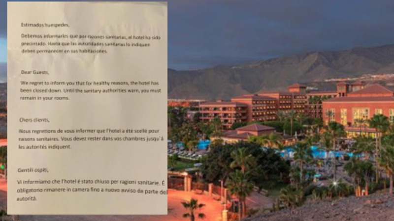 Papiret her er hængt op på hotellet og informerer om, at hotellet er lukket ned, og gæsterne skal forblive på deres værelser, indtil sundhedsmyndighederne siger andet. Det står også på fransk og italiensk