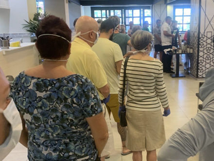 Siden i går har gæster uden symptomer desuden fået lov til at bruge fællesarealerne som spisesalen og nogle ligger endda ved poolen. Man får så nok en noget ujævn farve, da man skal have mundbind på...