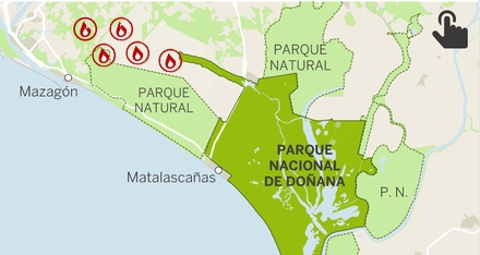 Med hensyn til selve naturparken Doñana fortsætter flammerne med at bevæge sig i den retning, men ikke med samme fart.