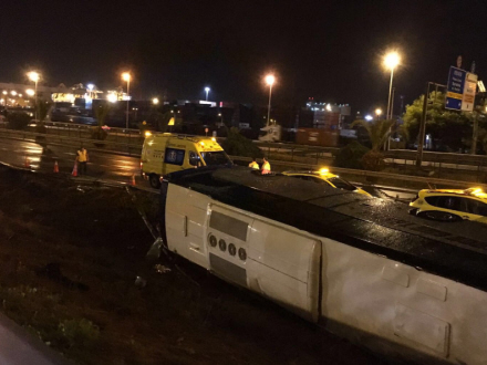 Bus med 23 turister fra Lloret de Mar på vej til lufthavnen i Barcelona væltede onsdag morgen klokken tre. Ulykken indtraf på motorvej B-10 ved kilometer 15, da bussen befandt sig i midtersporet.
