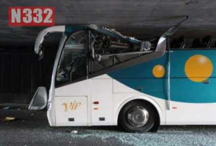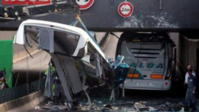 Det resulterede i, at taget af bussen blev revet af, og at 18 af bussens 59 passagerer måtte på hospitalet for at blive behandlet.