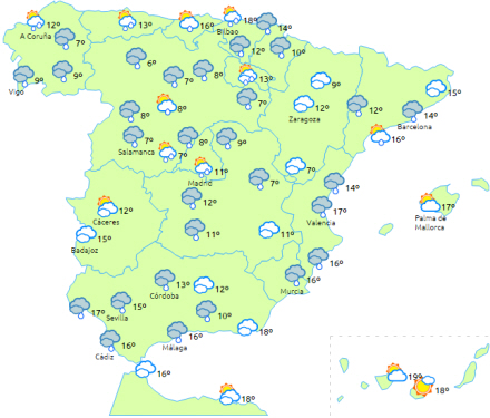 Skyet til overskyet himmel over det meste af halvøen med nedbør, undtagen i områderne langs den nordlige Atlanterhavskyst, østkysten af halvøen og Balearerne, hvor der kun vil være overskyet i perioder med mulighed for en smule let regn.