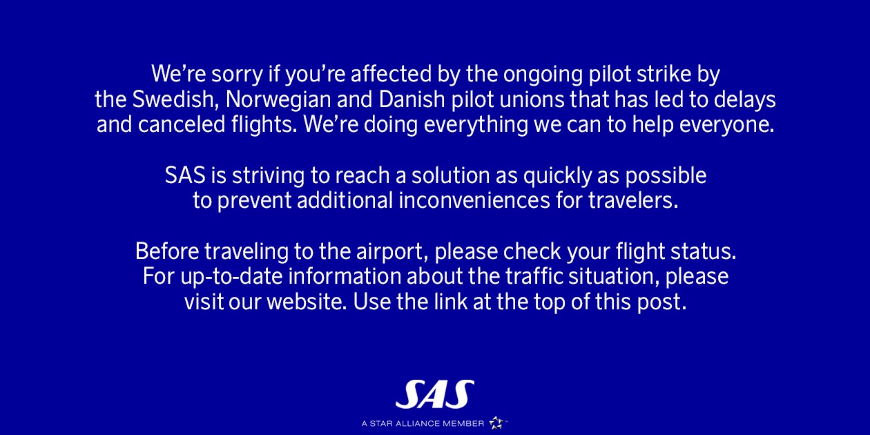 SAS udsendte denne besked på twitter i morges: seneste nyt her