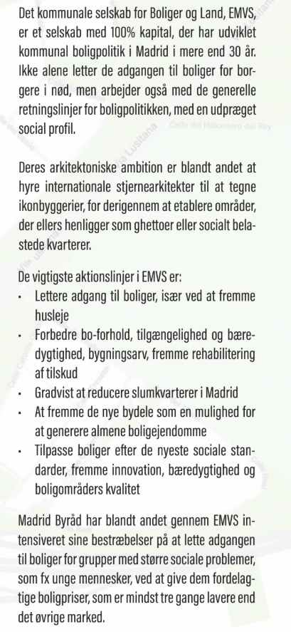 Forudsætningerne i Madrid og Aarhus er ikke helt ens, og der er forskel på, hvordan den almene boligsektor fungerer i de to lande. Blandt andet er lejeniveauet for en almen bolig indkomstafhængig i Madrid i modsætning til i Danmark.