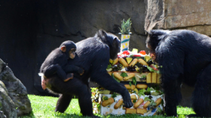 Foran publikum fik den lille chimpanse sammen med sin familie lækre delikatesser og gaver.