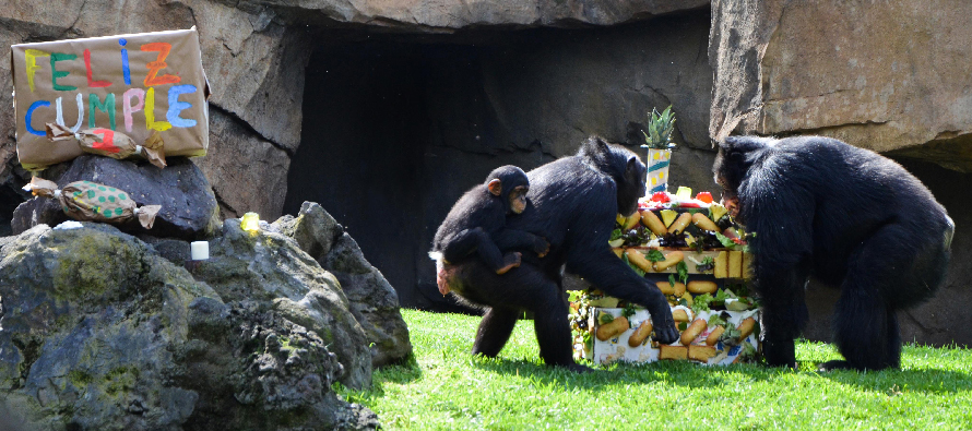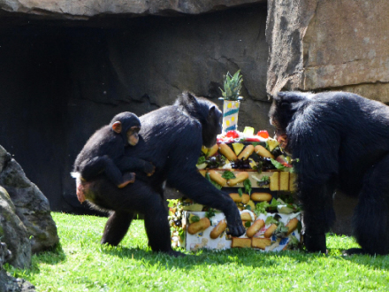 Kort før klokken 11 onsdag var publikum inviteret til at overvære fejringen i chimpanseanlægget, hvor dyrepasserne havde arrangeret det hele som en rigtig fødselsdagsfest med pynt, gaveæsker, overraskelser og "slik" rundt omkring, men den store, lækre lagkage havde hovedrollen: