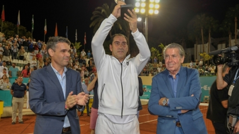 John McEnroe og Albert Costa med deres trofæer i glas flankerer Manolo Santa