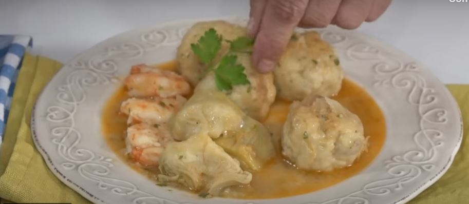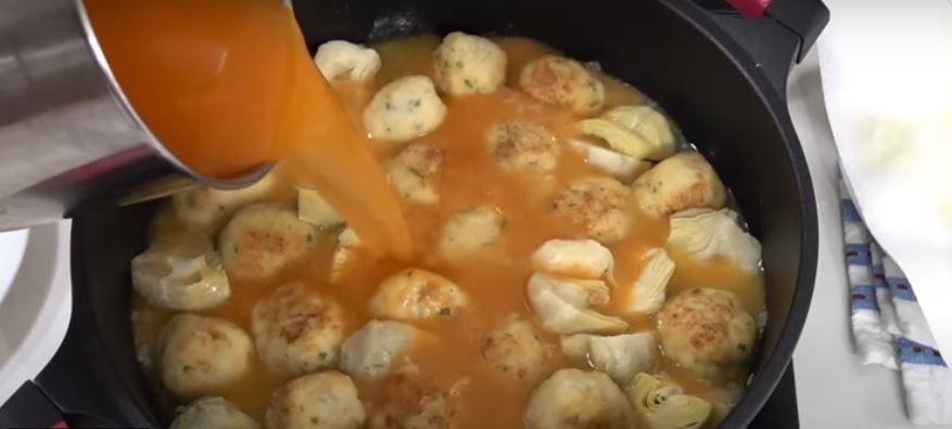Steg løget i den samme olie i en lav gryde ved middel varme. Tilsæt finthakket hvidløg, og lad løget blive gennemsigtigt. Tilsæt hvidvinen, og lad alkoholen reducere. Tilsæt kødbollerne og de halverede artiskokhjerter. Dæk med den godt siede bouillon. Lad det koge tildækket i 5 minutter. Tilsæt derefter rejer og persille. Kog under låg i yderligere to minutter, og så er det klaret.