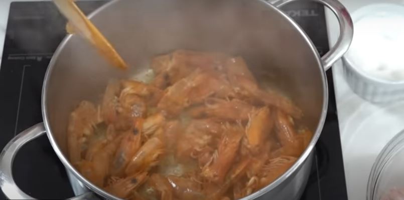 Kom en smule olivenolie på en varm pande. Steg rejernes hoveder og skaller, og pres dem godt, så de frigiver al saften. Tilføj kulmulehovedet og benene for at gøre bouillonen mere smagfuld. Tilsæt til sidst vand (ca. en halv liter) og lidt salt. Lad det koge ved svag varme i ca. 15 minutter.