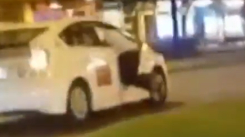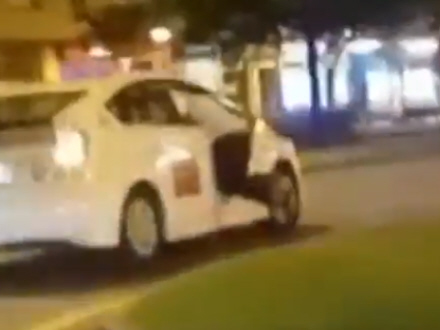 Hele optrinnet blev filmet af chokerede fodgængere og bilister, der kun kunne se til, mens taxaen fræsede forbi dem med underdelen af en mand dinglende ud af sidevinduet.