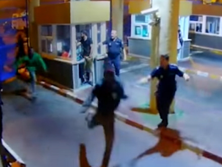 På videoen kan man tydeligt se, at betjenten desperat forsøger at sparke ud efter de løbende immigranter i forsøget på at dæmme op for indgangen, men det gik ikke godt.