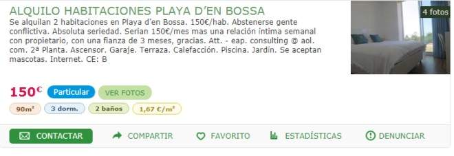 Annoncen på en kendt boligportal tilbød to værelser på Playa d'en Bossa, som er et af de mest populære ferieområder inden for luksusturisme.
