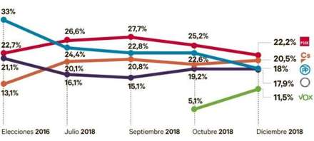 Meget kan ske fremover, men skulle den hidtidige tendens fortsætte, vil PSOE og PP fortsat falde, Ciudadanos vil stige og Unidos Podemos ligge nogenlunde stabilt. VOX vil muligvis gå yderliegre frem.