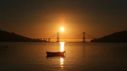 Solnedgang ved flodmundingen i Vigo, Galicien