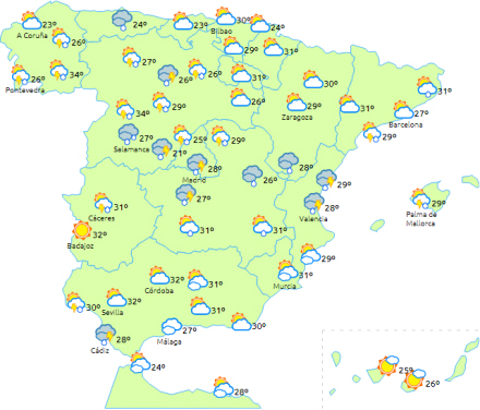 Faldende dagstemperaturer i halvøens indre egne især i de områder, hvor der kommer tordenbyger. Derimod stiger de i den østlige ende af nordvestkysten, mens der er få ændringer i resten. Maksimumniveauer når 30 grader i de sydvestlige indre egne.