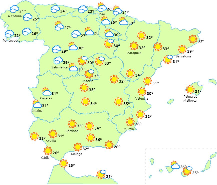 Høje temperaturer i de østlige, indre områder af halvøen og på De Baleariske Øer.
