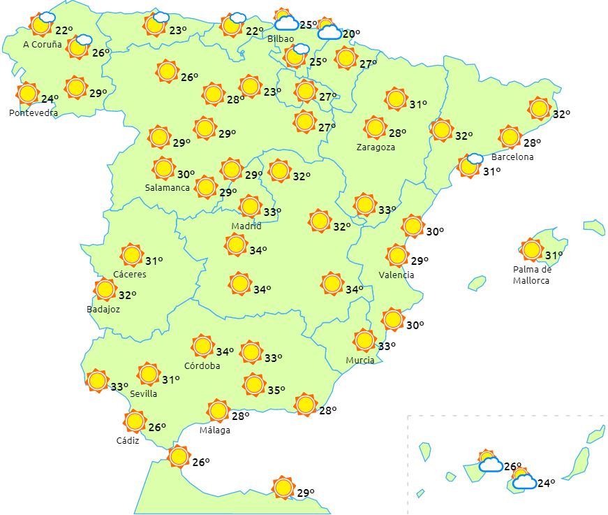 Letskyet eller klar himmel over resten af halvøen, De Baleariske Øer, Ceuta og Melilla.