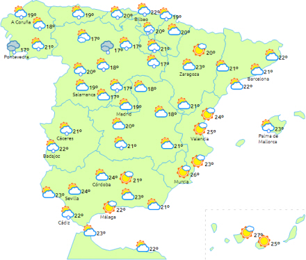 Skyet himmel med morgentåge og tilbøjelighed til overskyet himmel i slutningen af dagen. Minimumstemperaturer med få ændringer og maksimum- i fald i de indre egne, og dermed havner vi på 20 til 23 grader og 11 til 14 i nat.