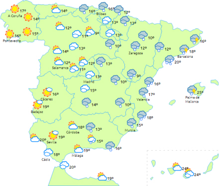 Stigende dagstemperaturer på Balearerne og i den nordvestlige og nordøstlige dele af halvøen - lokalt bemærkelsesværdige stigninger på Balearerne. Samtidig bliver det lidt køligere på resten af den østlige halvdel og ellers få ændringer i resten.