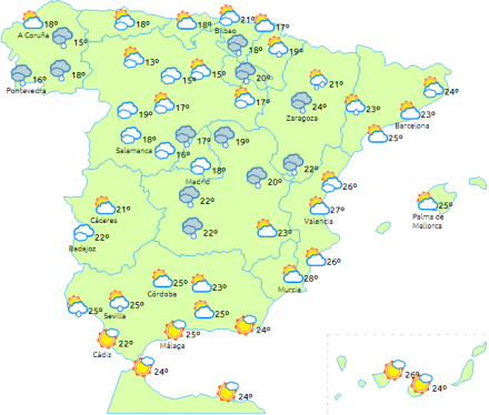 Faldende dagstemperaturer i nordvest, den øvre Ebro-dal og Extremadura, mens de stiger i de nordvestlige indre egne og halvøens Middelhavsområder og ellers få ændringer i resten.
