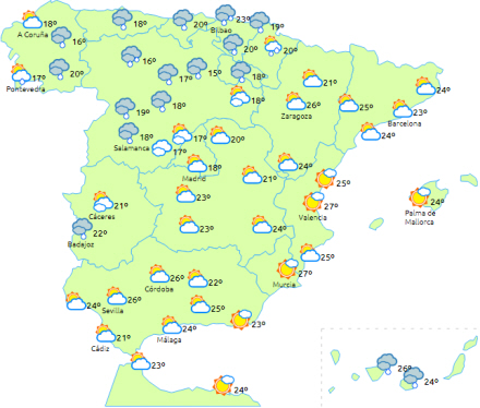 Generelt stigende dagstemperaturer, men med med få ændringer ved den sydlige Middelhavskyst og på De Kanariske Øer. Der ventes i øvrigt ret så markante stigninger i minimumstemperaturerne på den nordvestlige del af halvøen.