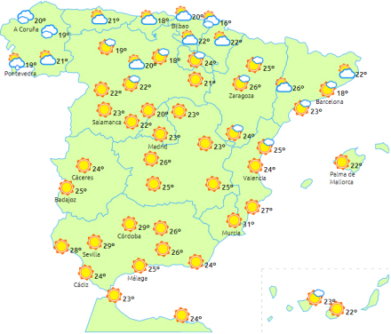 Dagstemperaturerne vil stige i de indre nordvestlige egne og på halvøens Middelhavsområder. Nætterne bliver også lunere i den nordøstlige halvdel af halvøen og på De Baleariske Øer.