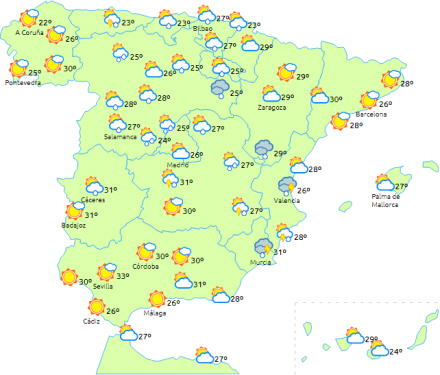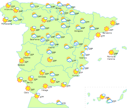 Vi kan heller ikke udelukke lejlighedsvis regn eller torden i Extremadura og de indre egne fra nord til syd.