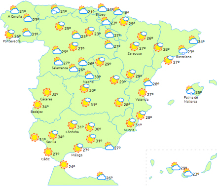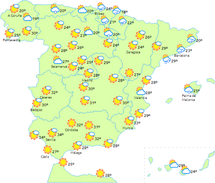 I Kantabrien og det nordlige Galicien tiltagende skydække hele dagen, og det resulterer til sidst med regn. Bygerne kan brede sig til den øvre Ebro-dal, de nordlige indre egne og Navarra.