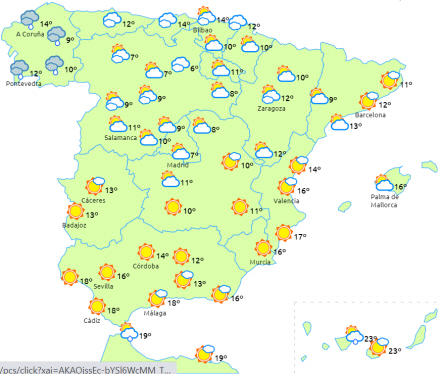 Temperaturerne falder på halvøen og De Baleariske Øer. Svag frost i de indre egne i nord, det nordlige Navarra, Aragon og Catalonien og i bjergområder - koldest i Pyrenæerne. Ingen ændringer på De Kanariske Øer.