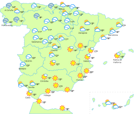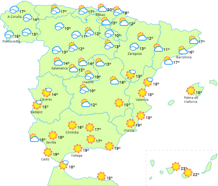 Overskyet i perioder i begyndelsen af dagen i de indre egne fra nord til syd, Extremadura, den øvre Ebro-dal, De Baleariske Øer og de nordlige, højtliggende egne af De Kanariske Øer. I alle disse områder tendens til letskyet i løbet af dagen.