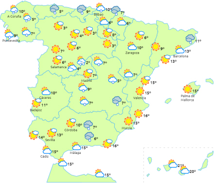 Morgentåge og tågebanker i de indre egne. Faldende temperaturer på ni til 19 grader og to til otte i nat - koldest i Antequera. Nordvestenvind.
