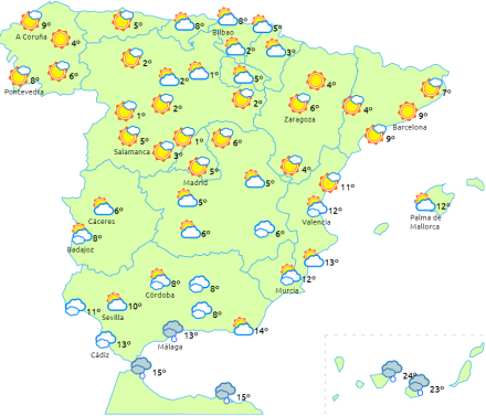 Snefald i Cantabrien og Baskerlandet, mens der advares om frost på Mallorca og halvøens indre egne - lokalt tung frost i bjergområderne.