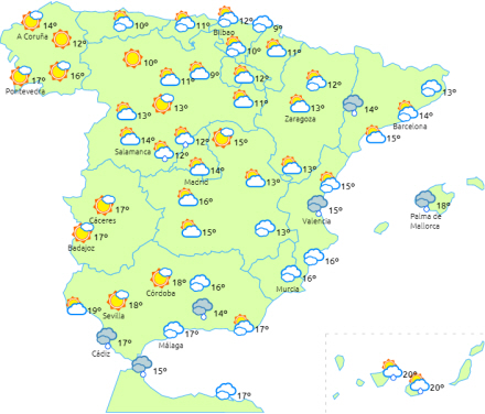 Overskyet i perioder over i resten af halvøen og De Baleariske Øer med mulighed for nogle byger eller generelt svage tordenbyger.