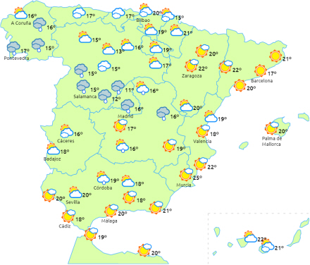 Halvøen og De Baleariske Øer er påvirket af et lavtryk, der giver ustabilitet med overvejende overskyet himmel, mens man dog i Middelhavsområdet og Ebro-dalen kun får mellem- og højtliggende skyer i perioder.