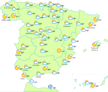 Stigende dagstemperaturer på De Baleariske Øer og i den nordlige og nordøstlige tredjedel af halvøen, mens de falder på den sydvestlige tredjedel. Om natten stigende temperaturer i den nordlige og centrale halvdel af halvøen.